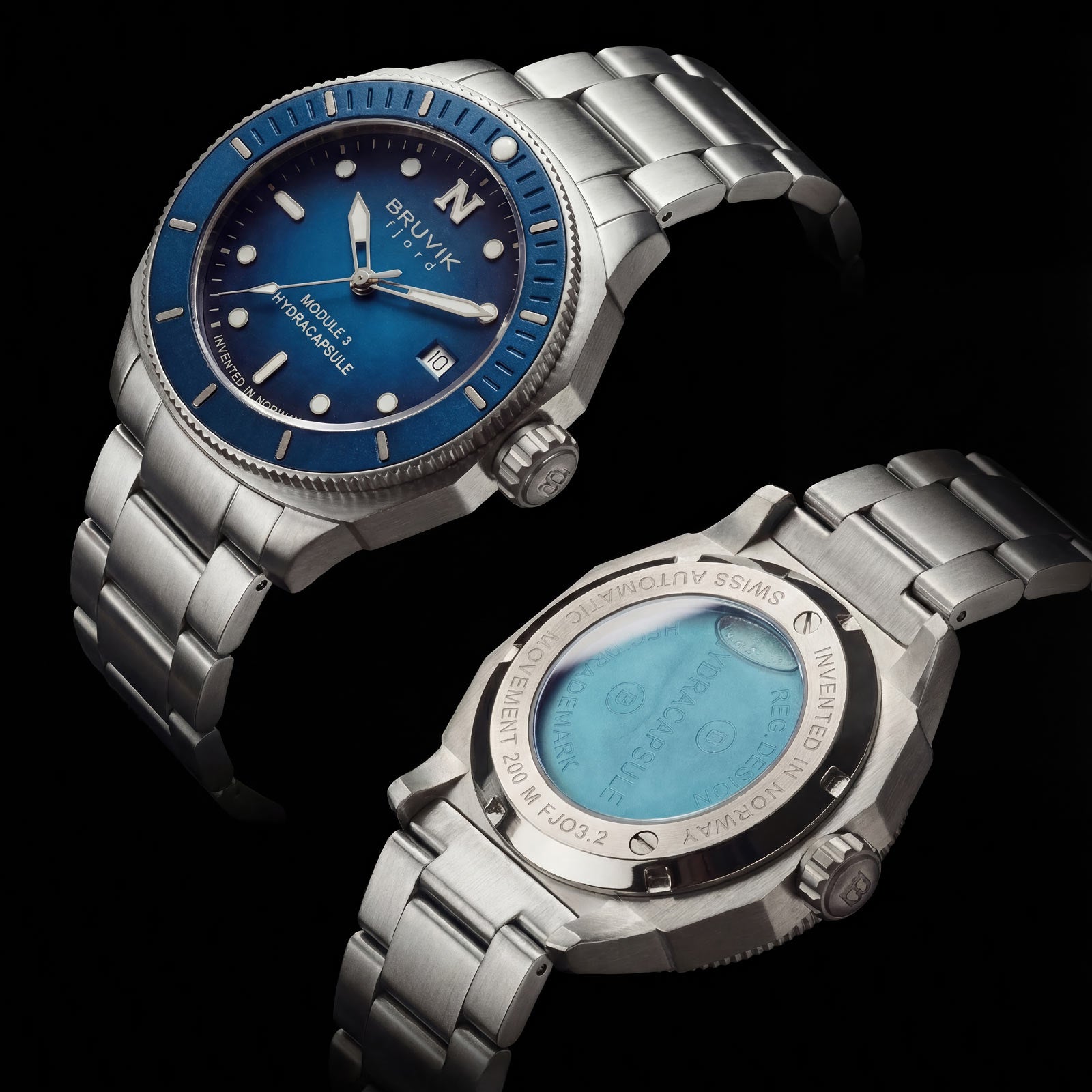 The Bruvik Fjord Hydracapsule® is a celebration of Norwegian nature, innovation, and design heritage. At its core lies the patented Hydracapsule® Module 3 — a sealed chamber embedded in the caseback, containing authentic fjord water from the Langfoss waterfall, collected in 2010. Positioned directly against the wrist, this rare element serves as a constant reminder of your connection to the raw beauty of nature.